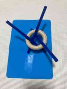 輪っかに青、赤、黄の棒を差し込んで、それを開くようにして輪っかを止めます。